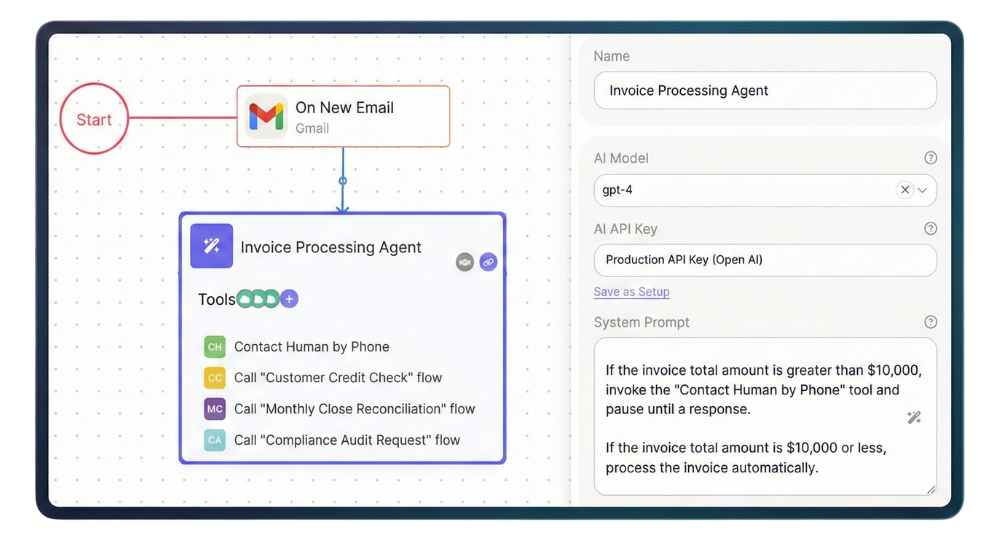 Your AI agents can invoke entire workflows as tools - including human-in-loop flows. Build modular, reusable components. Compose complex automations from simple building blocks.