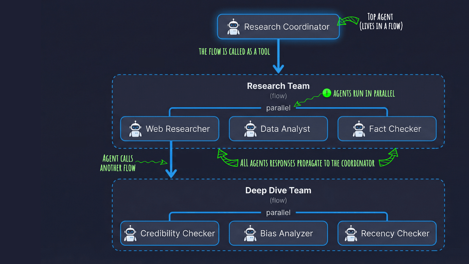 Your lead agent calls a flow containing a team of agents working in parallel. Any of those agents can call their own flows with their own teams. Nest as deep as you need. This is orchestration that scales exponentially - not A → B → C handoffs.